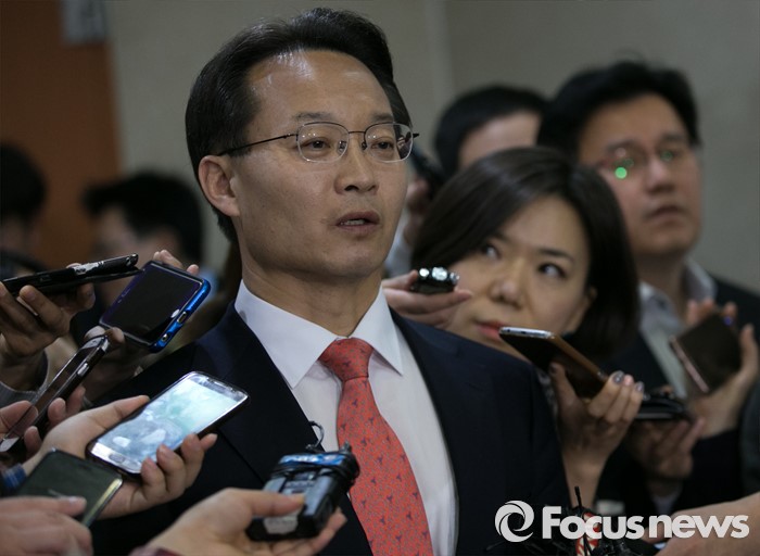 (서울=포커스뉴스) 공천 탈락한 조해진 새누리당 의원이 18일 오전 서울 여의도 국회 정론관에서 탈당 및 20대 총선 무소속 출마 기자회견을 마친 뒤 취재진 질문에 답하고 있다.