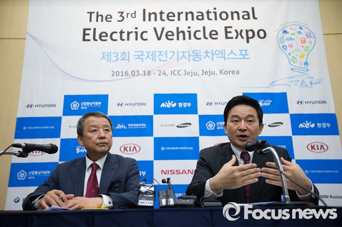(제주=포커스뉴스) 원희룡 특별자치도지사(오른쪽)가 18일 오전 제주 서귀포 제주국제켄벤션센터에서 열린 제3회 국제전기자동차엑스포에서 김대환 국제전기차엑스포 조직위원장과 함께 기자회견을 하고 있다.