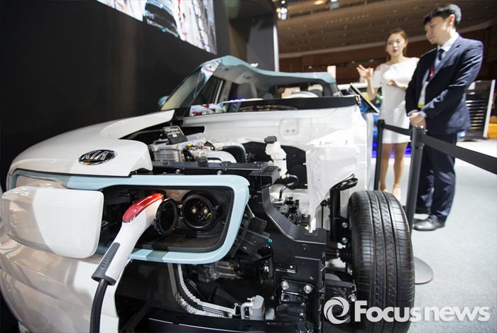 (제주=포커스뉴스) 18일 오전 제주 서귀포 제주국제컨벤션센터에서 열리고 있는 2016 국제전기자동차엑스포에서 기아 전기자동차 '소울'을 소개하고 있다.