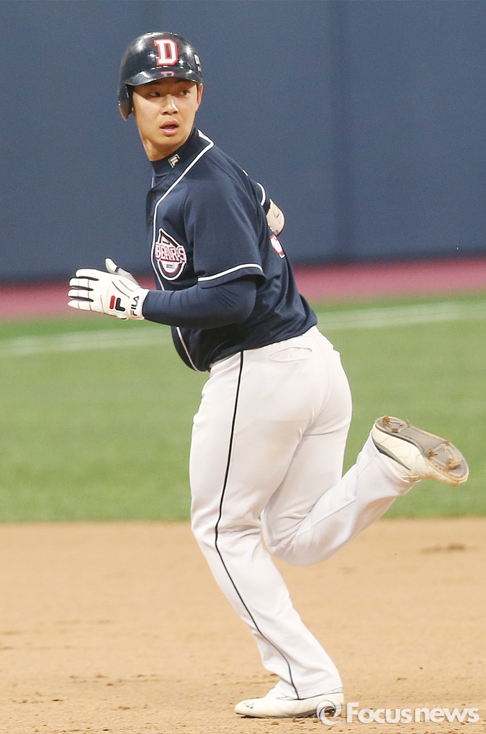 (서울=포커스뉴스) 18일 서울 고척스카이돔에서 열린 2016 프로야구 시범경기 두산-넥센 경기 7회 무사 2루에서 두산 서예일이 우월 2점 홈런을 치고 타구가 떨어진 지점을 바라보며 베이스를 돌고 있다.