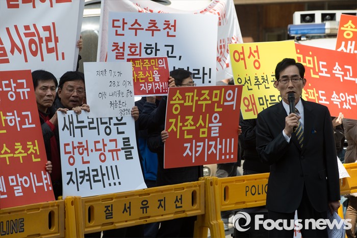 (서울=포커스뉴스) 18일 오후 서울 영등포구 새누리당사 앞에서 송파구(을) 주민들이 여론조사 하위권 단수추천 철회 및 송파구민이 원하는 경선 실시를 촉구하고 있다.