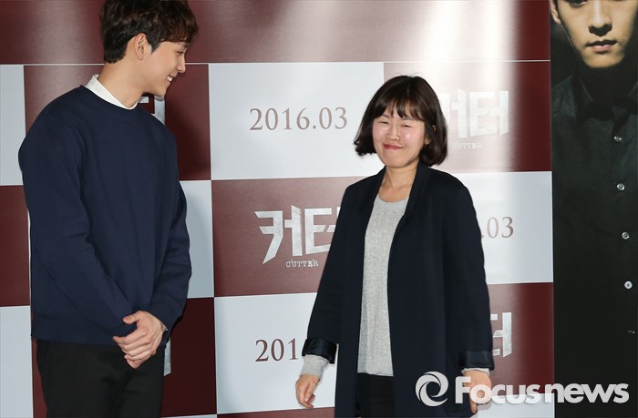(서울=포커스뉴스) 18일 오후 서울 성동구 왕십리CGV에서 열린 영화 '커터' 언론시사회에 참석한 배우 최태준이 포토타임을 위해 이동하는 정희성 감독을 맞이하고 있다.