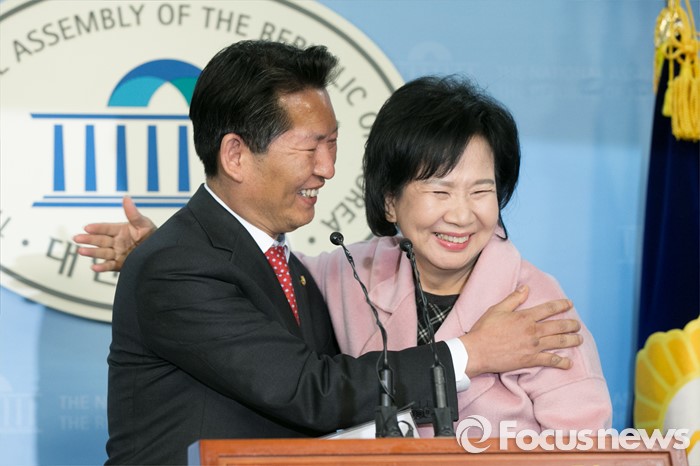 (서울=포커스뉴스) 손혜원(오른쪽) 더불어민주당 홍보위원장이 18일 오후 서울 여의도 국회 정론관에서 출마 기자회견을 마친 뒤, 정청래 의원과 포옹하고 있다. 한편, 손 위원장이 출마하게 될 서울 마포을 지역구는 공천 배제 된 정청래 의원 지역구이다.