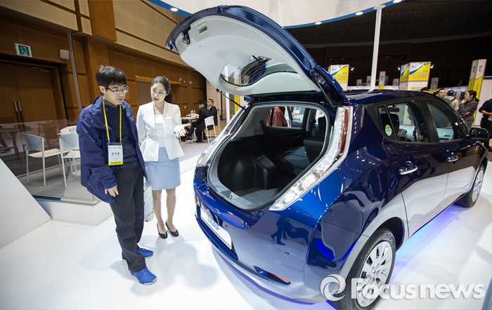 (제주=포커스뉴스) 18일 오전 제주 서귀포 제주국제컨벤션센터에서 열리고 있는 2016 국제전기자동차엑스포에서 한 관람객이 전기자동차 후면을 보고 있다.