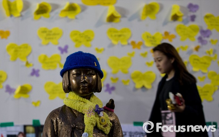 (서울=포커스뉴스) 18일 오전 서울 종로구 일본대사관 앞에서 열린 '한일 위안부 합의 폐기, 소녀상 철거 반대 대학생 100인 농성'에 참석한 학생이 소녀상 뒤를 지나가고 있다.