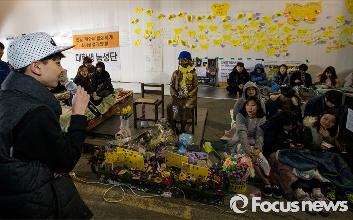 (서울=포커스뉴스) 18일 오전 서울 종로구 일본대사관 앞에서 열린 '한일 위안부 합의 폐기, 소녀상 철거 반대 대학생 100인 농성'에 참석한 학생이 발언하고 있다.