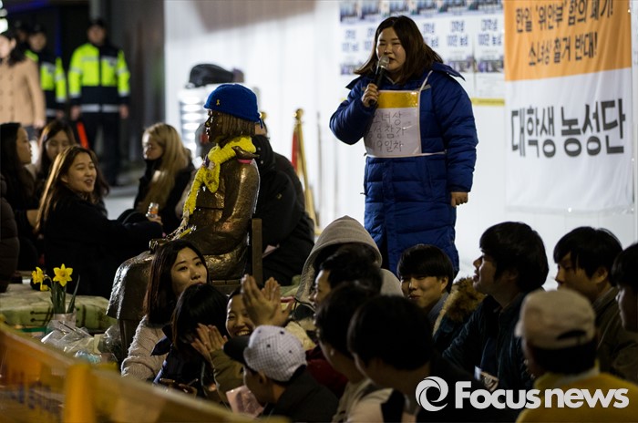 (서울=포커스뉴스) 18일 오전 서울 종로구 일본대사관 앞에서 열린 '한일 위안부 합의 폐기, 소녀상 철거 반대 대학생 100인 농성'에 참석한 학생들이 소녀상 곁을 지키고 있다.