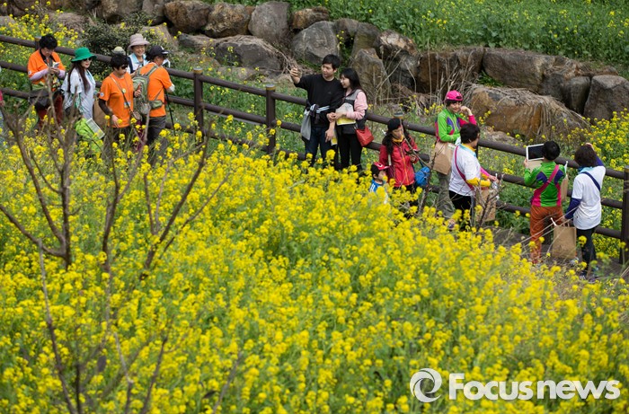 (제주=포커스뉴스)19일 오전 제주 서귀포 중문관광단지 일원에서 제18회 서귀포 유채꽃 국제걷기대회가 열리고 있다. 걷기대회에 참가한 관광객들이 엉덩물계곡 유채꽃길을 걷고 있다.
