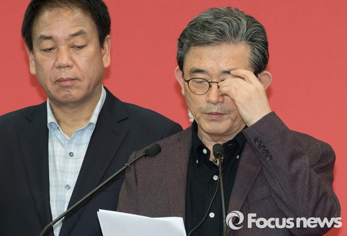 (서울=포커스뉴스) 이한구 공천관리위원장이 박종희 공관위원과 함께 19일 오후 서울 영등포구 새누리당사에서 총선 공천을 위한 여론조사 경선 결과를 발표하고 있다.