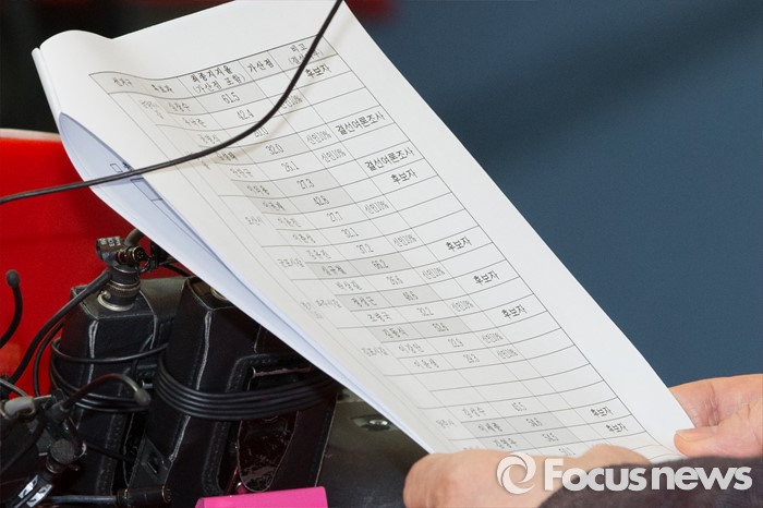 (서울=포커스뉴스) 이한구 공천관리위원장이 박종희 공관위원과 함께 19일 오후 서울 영등포구 새누리당사에서 총선 공천을 위한 여론조사 경선 결과를 발표하고 있다.