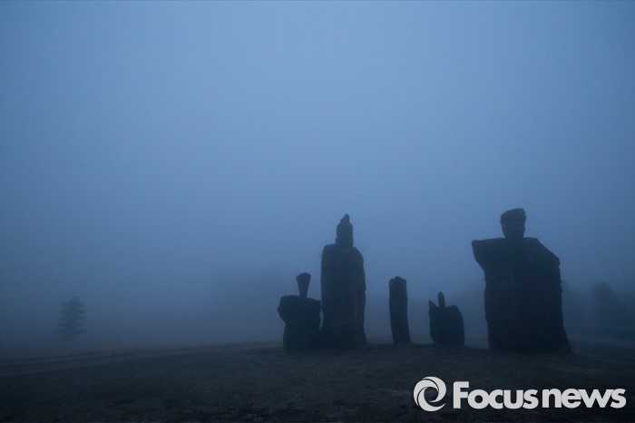 (제주=포커스뉴스) 안개 낀 18일 오후 제주시 남조로 돌문화공원에 마을의 무사안녕을 기원하는 방사탑들이 놓여져 있다.