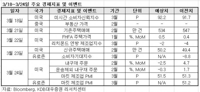 오는 24일(현지시간)에는 미국 3월 마킷 PMI 제조업지수가 발표된다. 현재 시장 추정치는 51.5로 전월 51.3 대비 소폭 개선될 것으로 예상된다.
