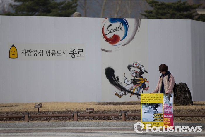 (서울=포커스뉴스) 20일 오후 서울 종로구 청운동사무소 분수대에서 백도라지씨가 경찰의 수사와 사과를 촉구하며 1인 시위를 하고 있다. 이날 백씨는 지난해 11월 집회 도중 물대포에 맞아 쓰러진 아버지 백남기씨 사건에 대한 경찰당국의 정확한 수사와 사과를 촉구했다.