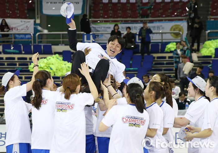(부천=포커스뉴스) 20일 부천체육관에서 열린 2015-2016 여자프로농구 챔피언결정전 3차전에서 KEB하나은행을 물리치고 3승으로 통합 우승을 차지한 우리은행 선수들이 위성우 감독을 헹가래치고 있다.