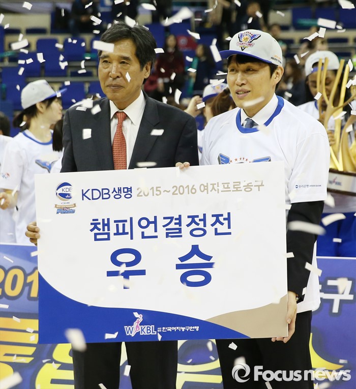 (부천=포커스뉴스) 20일 부천체육관에서 열린 2015-2016 여자프로농구 챔피언결정전 3차전에서 KEB하나은행을 물리치고 3승으로 통합 우승을 차지한 우리은행 위성우 감독이 신선우 WKBL 총재와 기념사진을 찍고 있다.