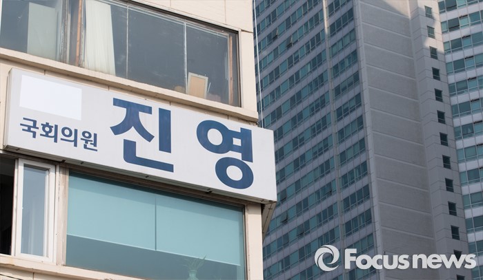 (서울=포커스뉴스) 21일 오전 서울 용산구 진영 의원 지역구 사무실 간판의 정당과 기호 표시가 가려져 있다. 진 의원은 새누리당에서 공첸 배제된 뒤 탈당해 더불어민주당으로 입당했다.