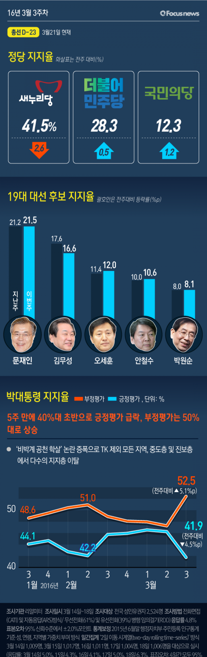 이번 주간집계는 2016년 3월 14일부터 18일까지 5일간 전국 19세 이상 유권자 2,524명을 대상으로 전화면접(CATI) 및 자동응답(ARS) 방식으로 무선전화(61%)와 유선전화(39%) 병행 임의걸기(RDD) 방법으로 조사했고, 응답률은 4.8%이다. 통계보정은 2015년 12월말 행정자치부 주민등록 인구통계 기준 성, 연령, 권역별 가중치 부여 방식으로 이루어졌고, 표집오차는 95% 신뢰수준에서 ±2.0%p이다. 일간집계는 ‘2일 이동 시계열(two-day rolling time-series)’ 방식으로 3월 14일 1,009명, 3월 15일 1,017명, 16일 1,011명, 17일 1,004명, 18일 1,006명을 대상으로 실시했고, 응답률은 3월 14일 5.0%, 15일 4.3%, 16일 4.1%, 17일 5.0%, 18일 6.3%, 표집오차는 4일간 모두 95% 신뢰수준에서 각각 ±3.1%p이다. 일간집계의 통계보정 방식은 주간집계와 동일하다.