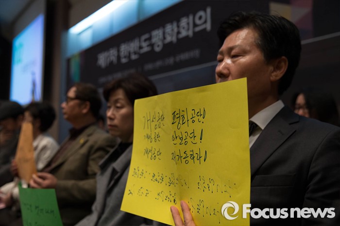 (서울=포커스뉴스) 21일 오전 서울 종로구 프레스센터에서 열린 제1차 '한반도 평화 회의'에서 참석자들이 개성공단 재가동을 촉구하는 피켓을 들고 있다.