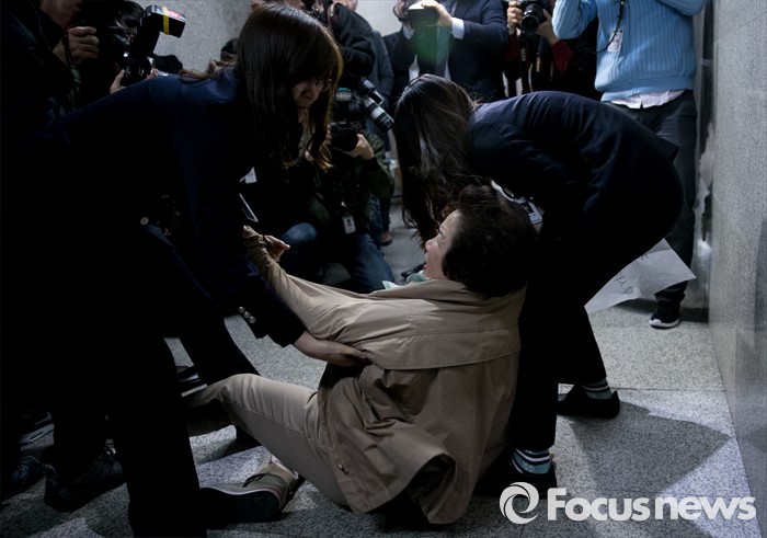 | △ 비례대표 공천 항의 중 끌려나가는 당원 |