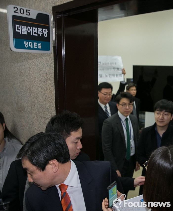 (서울=포커스뉴스) 21일 오전 서울 여의도 국회에서 이종걸(왼쪽) 더불어민주당 원내대표가 비례대표 후보 공천 등에 항의하고 있는 전국실버위원회 당원들과 대화 중 잠시 비대위 대표회의실을 나서고 있다.