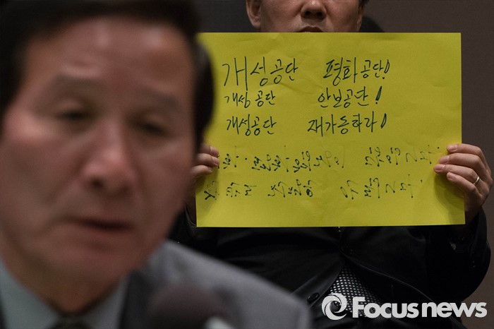 (서울=포커스뉴스) 21일 오전 서울 종로구 프레스센터에서 열린 제1차 '한반도 평화 회의'에서 참석한 정기섭 개성공단기업협의회 회장이 대북관계 긴장 완화를 촉구하고 있다.