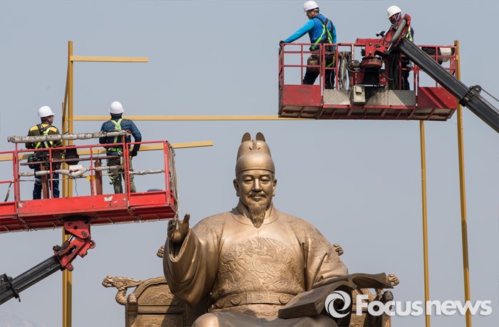 (서울=포커스뉴스) 21일 오전 서울 광화문 광장 세종대왕상에 한ㆍ불수교 130주년 기념 미술작품 '킹 오브 사인스'가 설치되고 있다.
