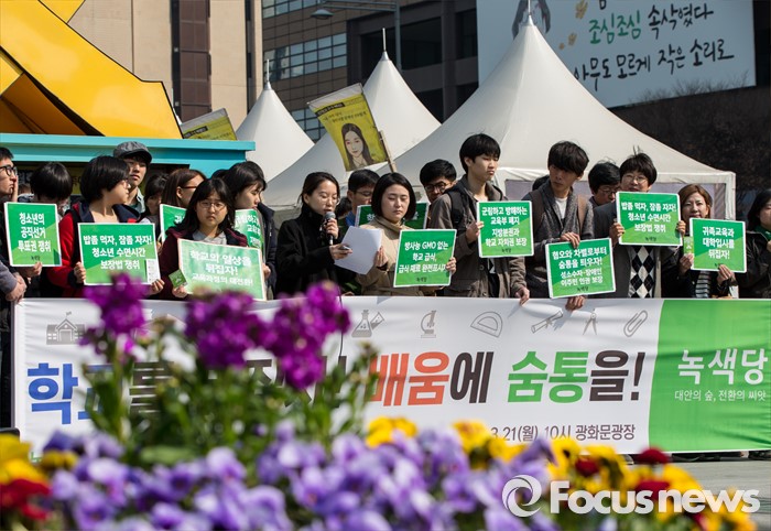 (서울=포커스뉴스) 21일 오전 서울 광화문 광장에서 열린 녹색당 교육(배움) 공약 발표 기자회견에 참석한 김주온 비례후보 예비자가 회견문을 읽고 있다.