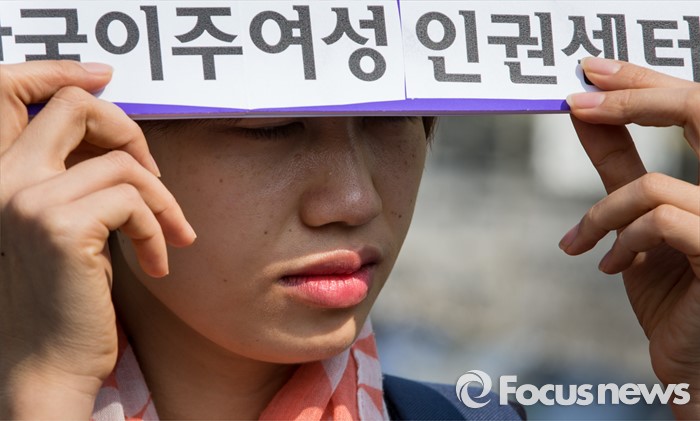 (서울=포커스뉴스) 21일 오전 서울 광화문 광장에서 열린 '세계인종차별철폐의 날 맞이 제 이주 인권 노동 사회단체 국제연대 공동 기자회견'에 참석한 베트남 이주여성이 인종차별에 반대하는 손팻말을 들고 있다.