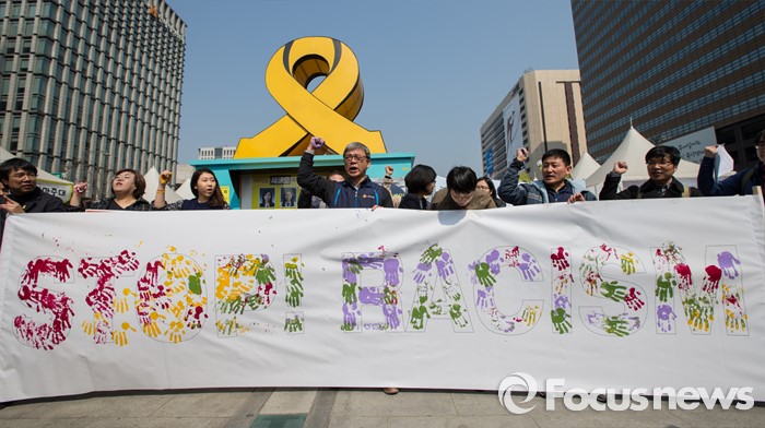 (서울=포커스뉴스) 21일 오전 서울 광화문 광장에서 열린 '세계인종차별철폐의 날 맞이 제 이주 인권 노동 사회단체 국제연대 공동 기자회견'에서 참석자들이 'STOP RACISM'(인종차별 금지)가 적힌 현수막과 함께 구호를 외치고 있다.