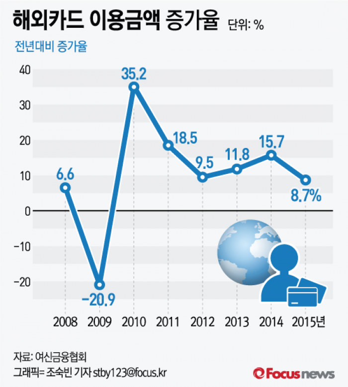 (서울=포커스뉴스) 21일 여신금융협회가 발표한 ‘2015년 해외카드이용실적 분석’ 자료에 따르면 지난해 우리나라 국민이 사용한 카드결제 금액은 132억6000만달러로 전년 대비 8.7% 늘었다.