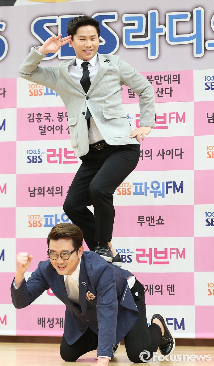 (서울-포커스뉴스) 21일 오후 서울 SBS 목동사옥에서 열린 SBS 라디오 봄 개편 기자간담회에 참석한 개그맨 양세형(위쪽) 윤형빈이 포토타임을 갖고 있다.