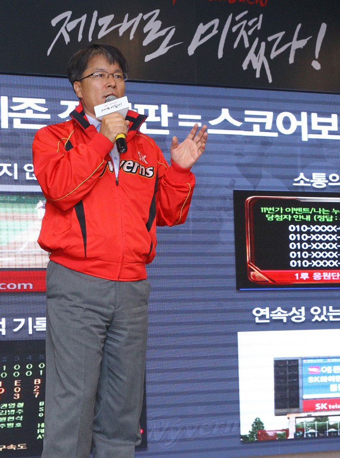 SK와이번스 류준열 대표이사는 "모든 구성원이 미치겠다는 열정을 가져야 팬들에게도 파격과 울림을 줄 수 있다. 세계 최고 하드웨어와 기술력이 투입된 빅보드를 통해 파격적인 콘텐츠로 팬들에게 재미와 감동을 극대화시키겠다. 색다른 아이템을 꾸준히 개발하고 실행해 야구팬이라면 누구나 인천SK행복드림구장을 꼭 찾고 싶도록 만들겠다"고 포부를 밝혔다.프로야구 SK 와이번스 류준열 대표이사가 20일 '레알스포테인먼트' 추진과 관련 콘텐츠에 대한 설명을 하고 있다. <사진제공=SK 와이번스>프로야구 SK가 추진하는 '레알스포테인먼트' 슬로건 '제대로 미쳤다' 로고. <사진제공=SK 와이번스>