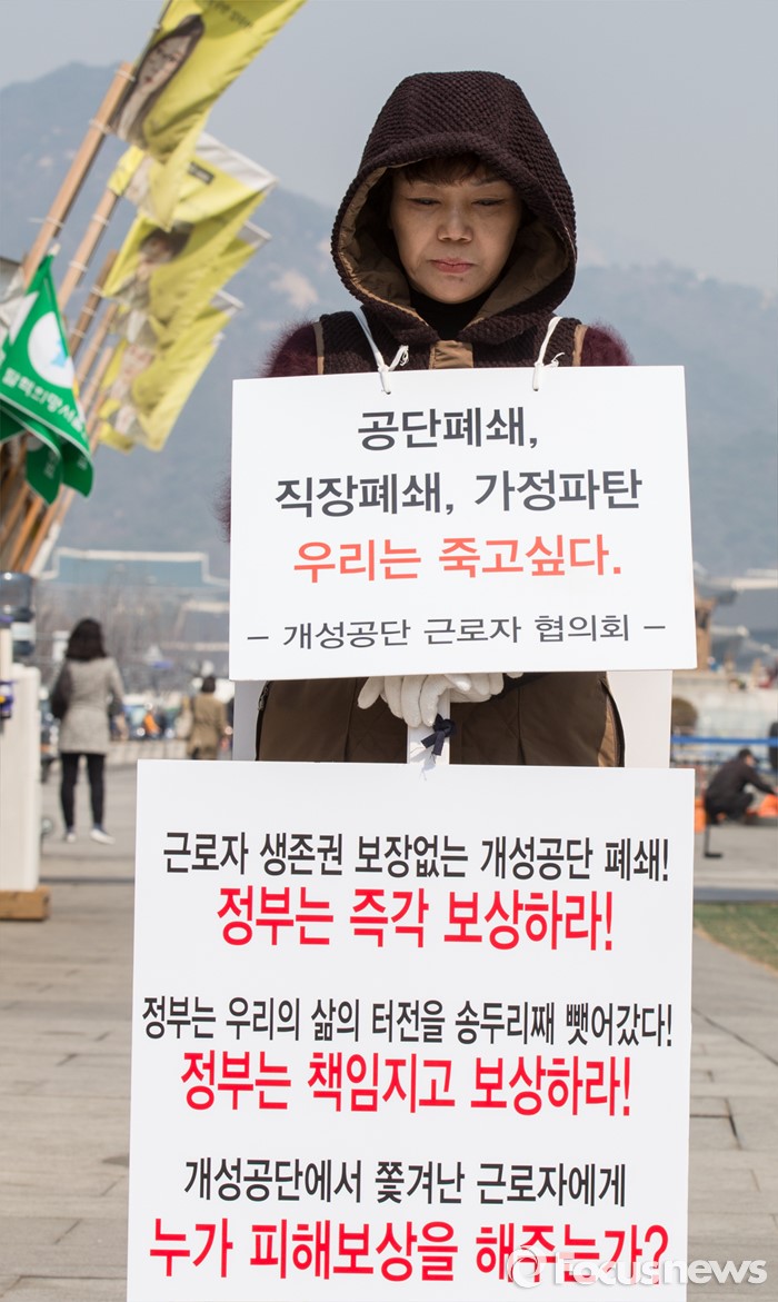 (서울=포커스뉴스) 21일 오전 서울 광화문 광장에서 개성공단 근로자 협의회의 한 관계자가 개성공단 폐쇄에 따른 정부의 보상을 촉구하는 팻말을 몸에 두르고 있다.