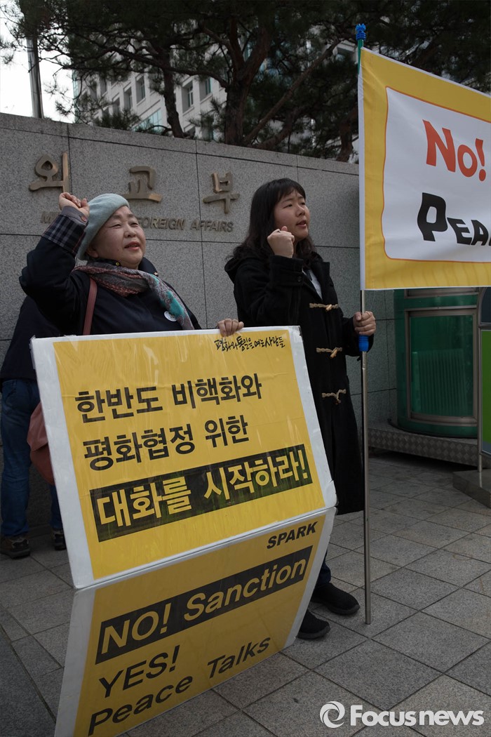 (서울=포커스뉴스) 21일 오후 정부서울청사 별관앞에서 '평화와 통일을 여는 사람들'(평통사) 회원들이 한미 양국의 강경 대북제재에 반대하며 구호를 외치고 있다.