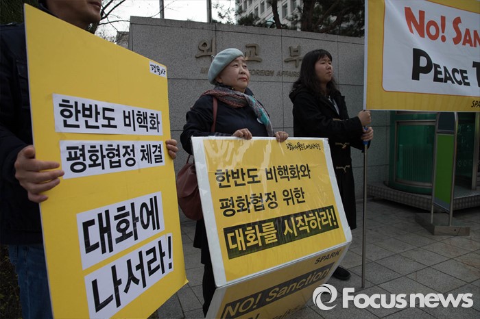 (서울=포커스뉴스) 21일 오후 정부서울청사 별관앞에서 '평화와 통일을 여는 사람들'(평통사) 회원들이 한미 양국의 강경 대북제재에 반대하며 집회를 열고 있다.