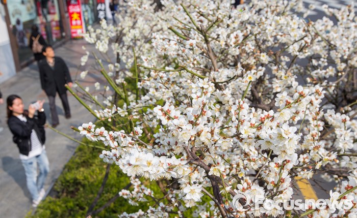 (서울=포커스뉴스) 봄 기운이 완연한 21일 오후 서울 종로구 탑골공원 인근에서 시민들이 봄볕을 머금고 만개한 매화를 촬영하고 있다.