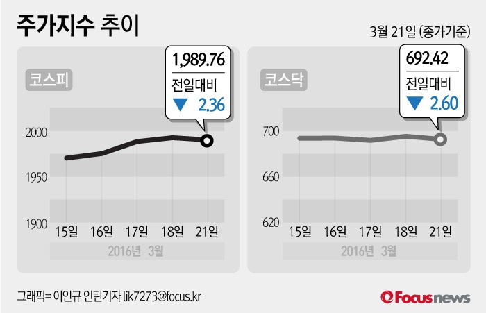 (서울=포커스뉴스) 21일 코스피지수는 전날 보다 0.12%(2.36포인트) 내린 1989.76에 장을 마쳤다. 코스닥지수는 전일 대비 0.37%(2.60포인트) 내린 692.42에 마감했다.