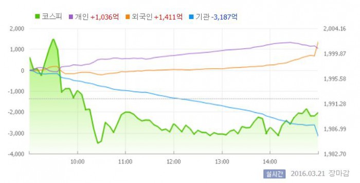 이날 코스피는 전거래일 대비 0.36% 상승한 1999.25로 장을 시작했다. 그러나 장 중반 기관이 대규모 순매도에 나서면서 지수는 하락세로 전환했다. 기관은 이날 유가증권시장에서 3188억원 규모의 순매도를 기록했다.
