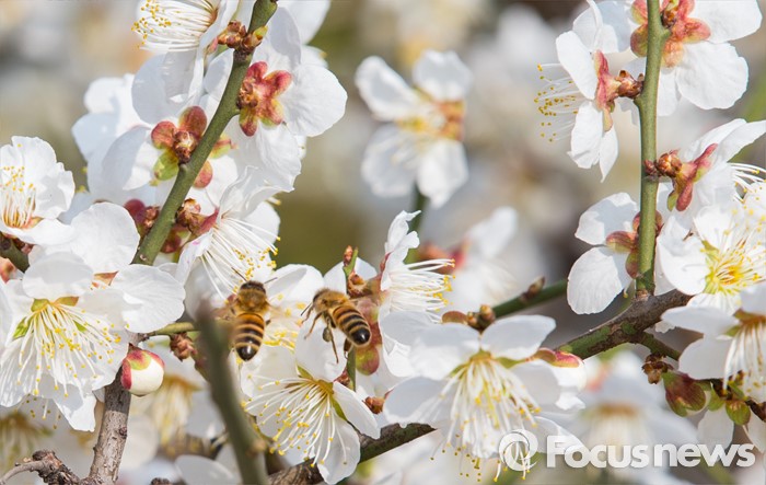 (서울=포커스뉴스) 봄 기운이 완연한 21일 오후 서울 종로구 탑골공원 인근의 매화 위에서 꿀벌이 꽃가루를 모으고 있다.