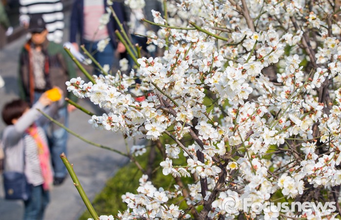 (서울=포커스뉴스) 봄 기운이 완연한 21일 오후 서울 종로구 탑골공원 인근에서 시민들이 봄볕을 머금고 만개한 매화를 촬영하고 있다.