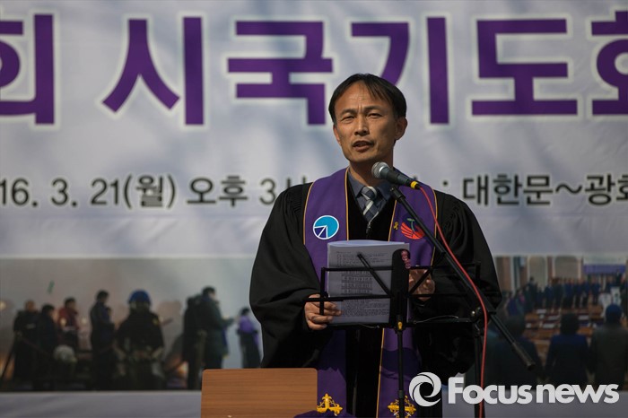 (서울=포커스뉴스) 21일 오후 서울 중구 덕수궁 대한문 앞에서 한국기독교 장로회 총회 '고난당하는 민주주의를 위한 시국기도회'가 열리고 있다.