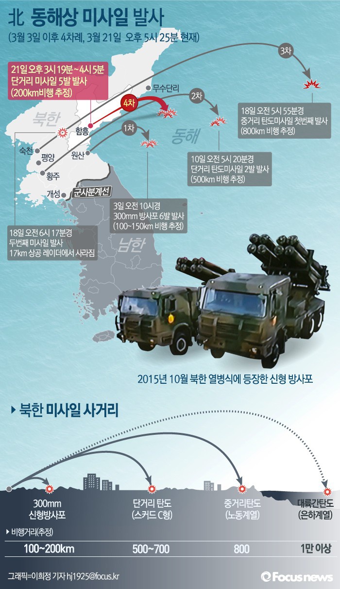 합참 관계자는 "현재 북한군의 특이한 동향은 포착되고 있지 않지만 북한군의 움직임을 면밀히 감시하고 있다 "우리 군은 한미 정보 자산을 동원해 북한군 동향을 주시하면서 만반의 대비태세를 유지하고 있다"고 밝혔다.(서울=포커스뉴스) 합동참모본부는 “북한이 21일 오후 3시 19분쯤 함경남도 함흥 북방 일대에서 동해상으로 불상의 단거리 발사체 4발을 발사했다”고 이날 밝혔다. 이어 4시 5분경 1발이 추가로 발사되면서 북한이 쏜 단거리 발사체는 총 5발로 파악됐다. 북한은 3월 3일부터 4차례에 걸쳐 무력도발 중이다.2016.03.21 이희정 기자