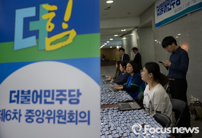 (서울=포커스뉴스) 더불어민주당이 비례대표 선정 문제를 놓고 진통을 겪고 있는 가운데 21일 서울 여의도 국회 의원회관 대회의실에서 예정된 중앙위원회의를 앞두고 관계자들이 중앙위원 이름표 앞에 앉아 있다. 이날 더민주 중앙위는 오후 3시 열릴 예정이었으나, 두 차례 연기를 거듭해, 오후 8시 열기로 결정됐다.