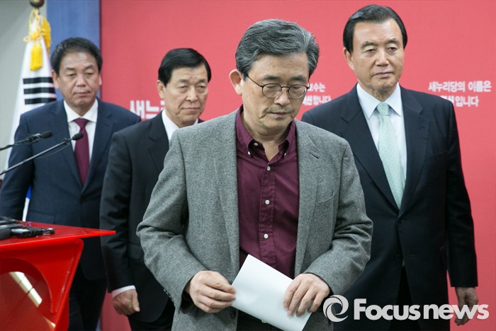 (서울=포커스뉴스) 이한구 새누리당 공천관리위원장과 위원들이 21일 오후 서울 여의도 당사에서 20대 총선 여론조사 경선 결과 발표를 마친 뒤 퇴장하고 있다. 왼쪽부터 박종희 위원, 황진하 부위원장, 이 위원장, 홍문표 위원.