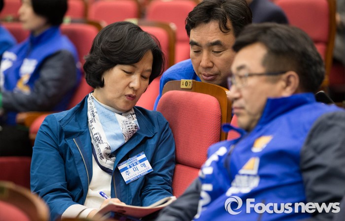 (서울=포커스뉴스) 비례대표 선정을놓고 김종인 비대위 대표가 당무를 거부하는 등 더불어민주당의 내홍이 계속되고 있는 가운데 22일 오전 서울 여의도 국회 의원회관에서 진행 중인 중앙위원회의에서 추미애 의원이 비례대표국회의원 후보자들의 정견발표를 들으며 동료 의원들과 대화를 나누고 있다.