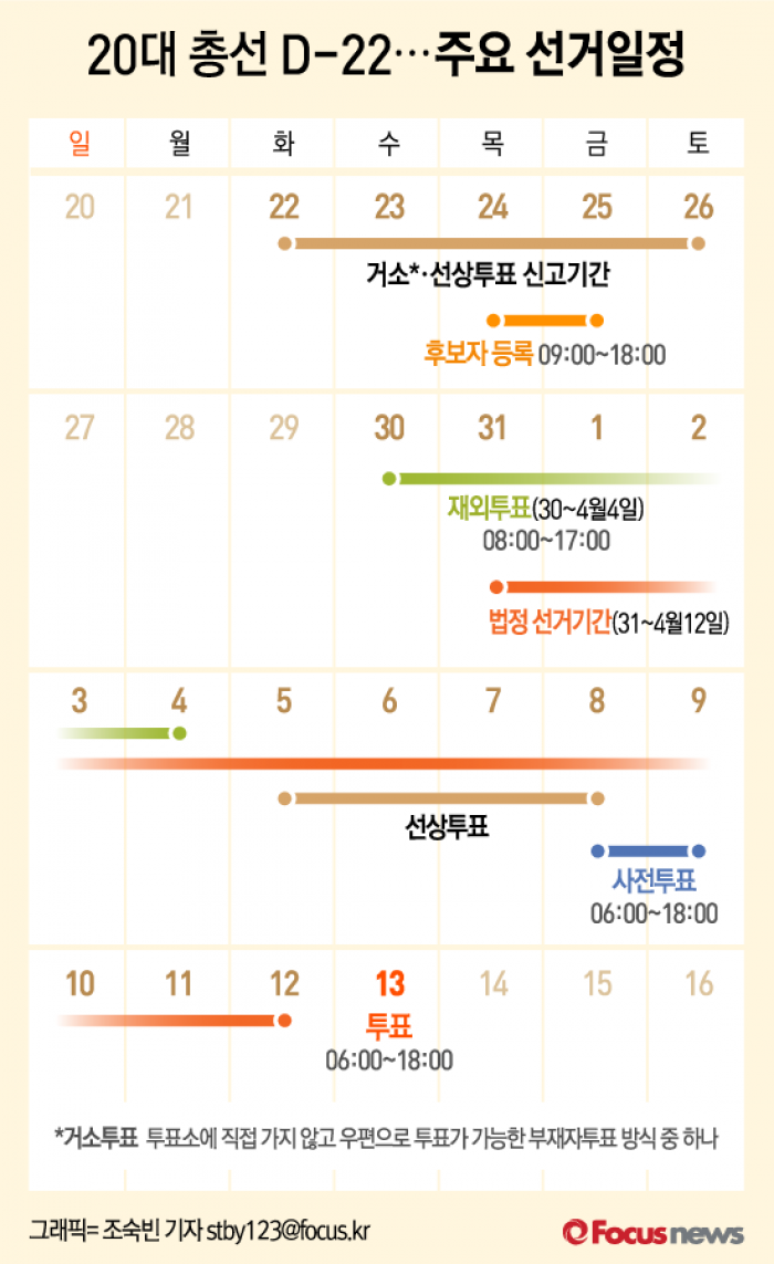 (서울=포커스뉴스) 오는 24일 진행되는 후보자 등록을 시작으로 제20대 국회의원 주요 선거 일정이 시작된다.