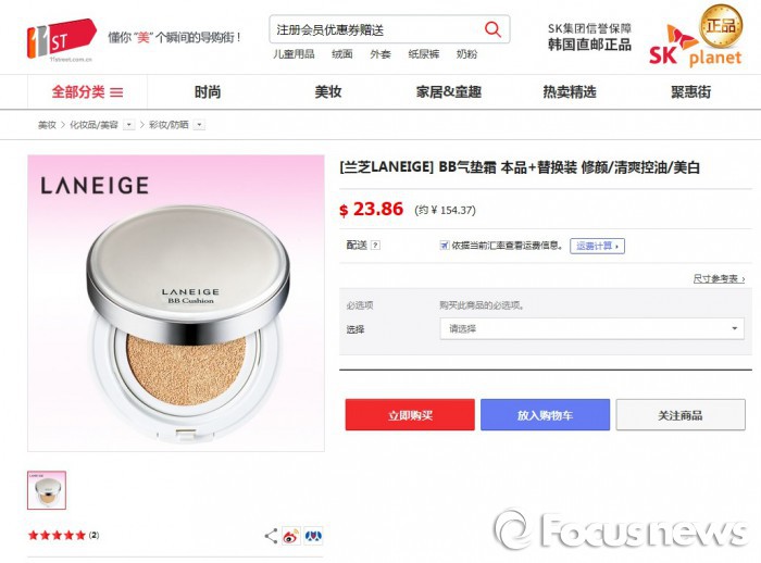 한편 11번가에서는 태양의 후예가 유행시킨 다나까 말투를 응용한 ‘첫눈에 반했지말입니다’ 기획전을 27일까지 한다. 11번가 MD가 추천한 이성의 마음을 사로잡는 패션·뷰티 아이템을 비롯해 외식상품권, 영화예매권 등을 최대 62% 할인 판매한다.22일 중문 11번가에서 판매 중인 라네즈 BB쿠션. 드라마 태양의 후예에서 송혜교가 사용하는 제품으로 인기를 끌고 있다.<사진제공=SK플래닛>