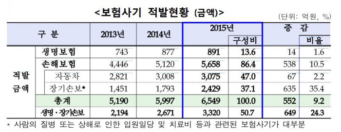보험사기 적발 건수 중 보험종목별로 살펴보면 생명보험과 장기손해보험의 적발 비중이 사상 처음으로 과반 이상을 차지했다. 생명보험과 장기손해보험의 보험사기 적발금액은 3320억원으로 전체의 50.7%를 차지했다.