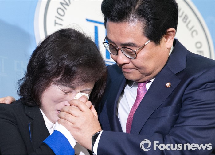 (서울=포커스뉴스) 20대 총선을 앞두고 공천 배제(컷오프)된 전병헌(오른쪽) 더불어민주당 의원이 22일 오전 서울 여의도 국회 정론관에서 대선승리를 위한 백의종군 선언 기자회견 도중 아내 조영하 씨를 위로하고 있다.