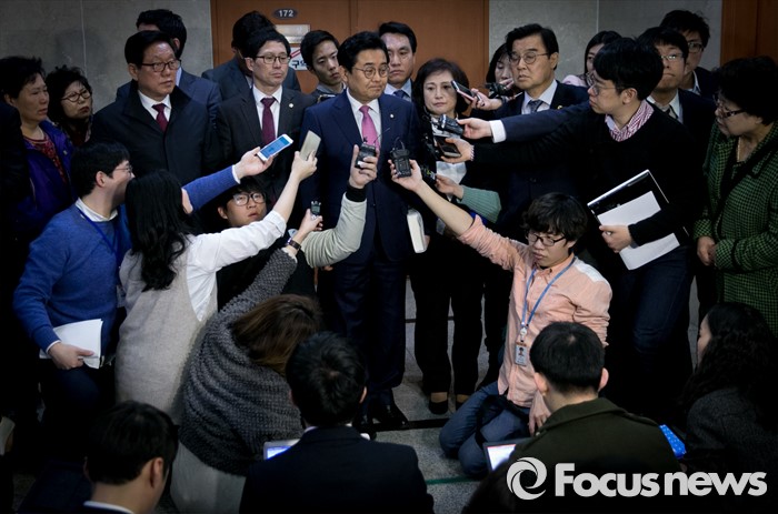 (서울=포커스뉴스) 20대 총선을 앞두고 공천 배제(컷오프)된 전병헌 더불어민주당 의원이 22일 오전 서울 여의도 국회 정론관에서 대선승리를 위한 백의종군 선언 기자회견을 마친 뒤 취재진 질문에 답하고 있다.